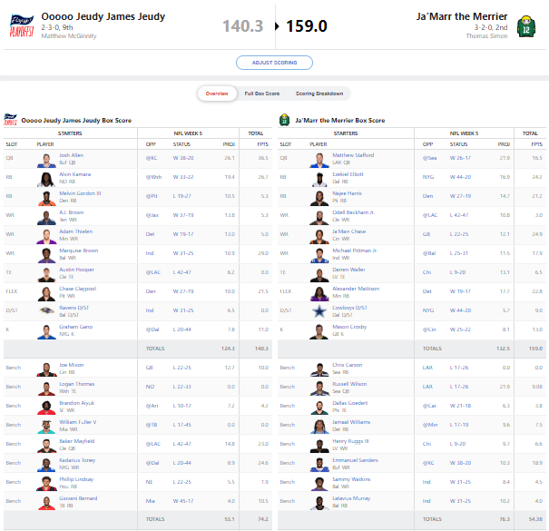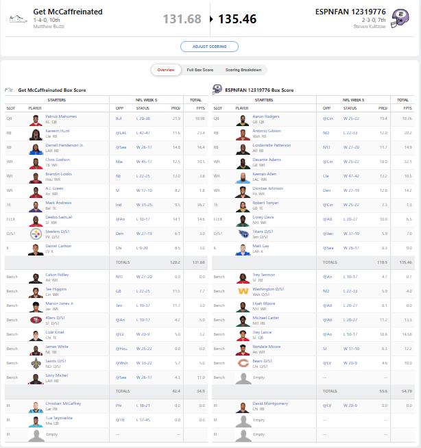Meanwhile, from Queens, I think we can here the faint cursing tones of Buzzi point at his TV and his multiple disappointing performances. Brandon Cooks and A.J. Green combined for 5.6 points even his kicker scored just 3.0 points. Patrick Mahomes has been held in relative regular form to being the season, and without his heroics, Buzzi’s outlook is growing bleaker.