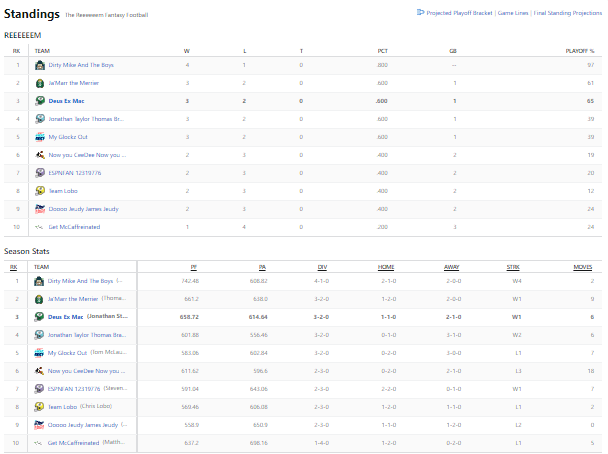 Standings at the end of week five. According to ESPN, Mike Ritz now has a 97% chance of making the playoffs. He also has the most points in the league […]
