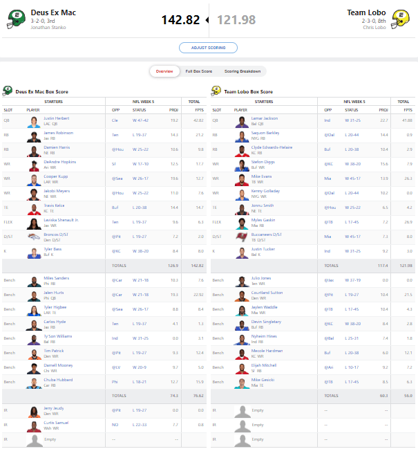 Justin Herbert, you beautiful soul. 42.82 points from the QB position is a great way to win a fantasy football matchup. Now we can move on.