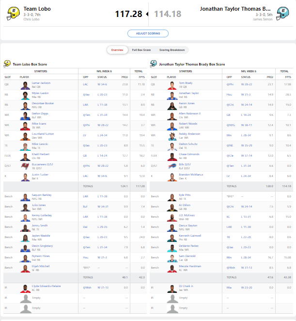 Monday night was the deciding night, but the deciding waiver wire mood was Lobo picking up Khalil Herbert for his flex position. 18.2 points for a waver wire pickup and a back up running back is just good fantasy football managing. That pick up made up for Lobo picking the wrong Miami Dolphin to play: Myles Gaskin had only 2.4 points while Jaylen Waddle scored 24.0 points on his bench.