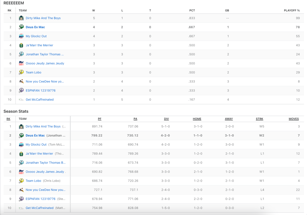 Standings at the end of week six. Mike continues to have the best team and his playoff prognostication is nearly 100%. Ronan is free falling. Four straight losses now. He […]
