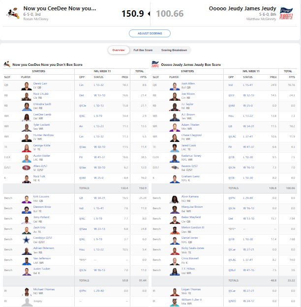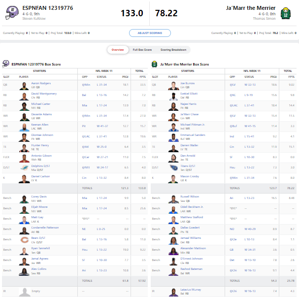 Looking at this matchup, besides Rodgers and Adams, Steve also got good production from Keenan Allen and Diontae Johnson who each scored over 15 points. He was able to manage a RESOUNDING victory without the full help of Michael Carter who got hurt during the game.