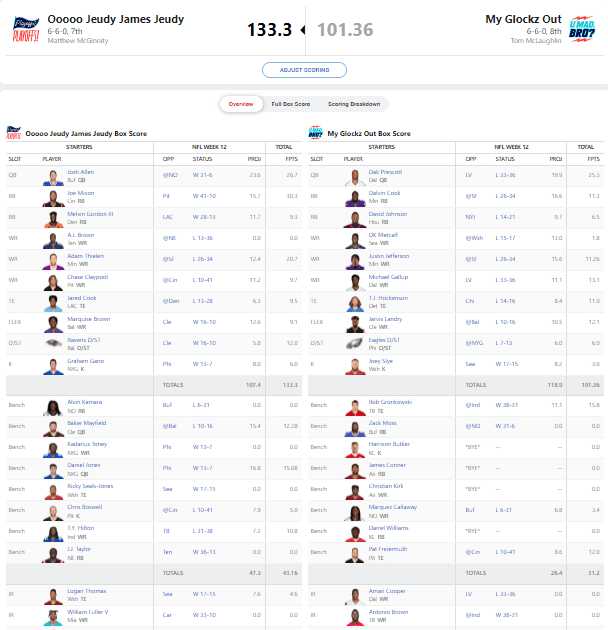 Josh Allen came to life and Joe Mixon erupted to help Matthew McGinnity get the win over Tom McLaughlin. The win by Ooooo Jeudy James Jeudy all by knocked My Glockz Out out of playoff contention. He needs to vault a TON of teams and therefore need to score like 200 points and have every team he needs to lose get crushed. A tall task. McGinnity played spoiler well.