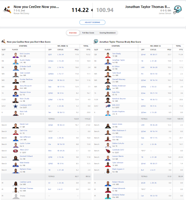 Buzzi was able to win the game despite Christian McCaffrey getting hurt against and Chris Godwin scoring only 2.7 points. Selfishly speaking as the man who owns Chubba Hubbard and who plays Buzzi next week with my playoff hopes on the line…it would have been real nice if Carolina wasn’t on a bye in week 13.