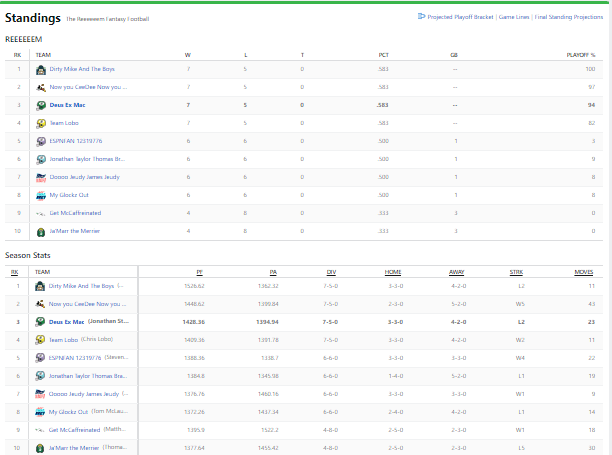 Ritz secures himself the regular season crown next week with a win. By the looks of it, he is going to get Kyler Murray back and have Tyreek Hill back in his lineup coming off the bye. Also, how often is George Kittle going to have only 1.8 points when his team scores 34? Ritz is in okay shape come the postseason, but it’s Lobo who may have stumbled into the best scenario.