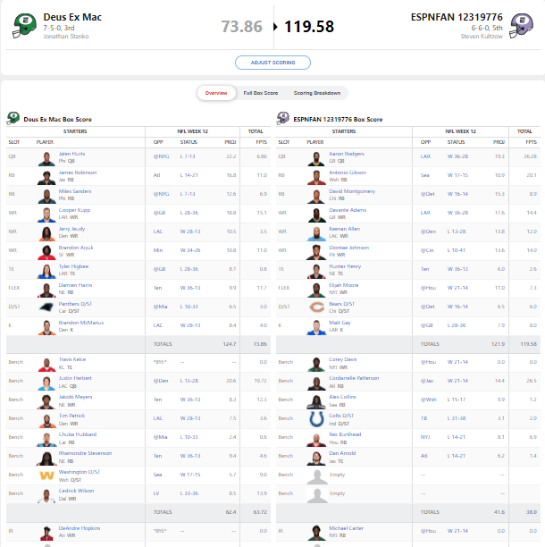 Not a good week for myself to put up the lowest scoring week of my season, but it benefits Steve and keeps his postseason hopes alive. Steve has scored at least 111 points in his four straight wins, but he has a large hill to climb come week 13 with Aaron Rodgers and Davante Adams on a bye.