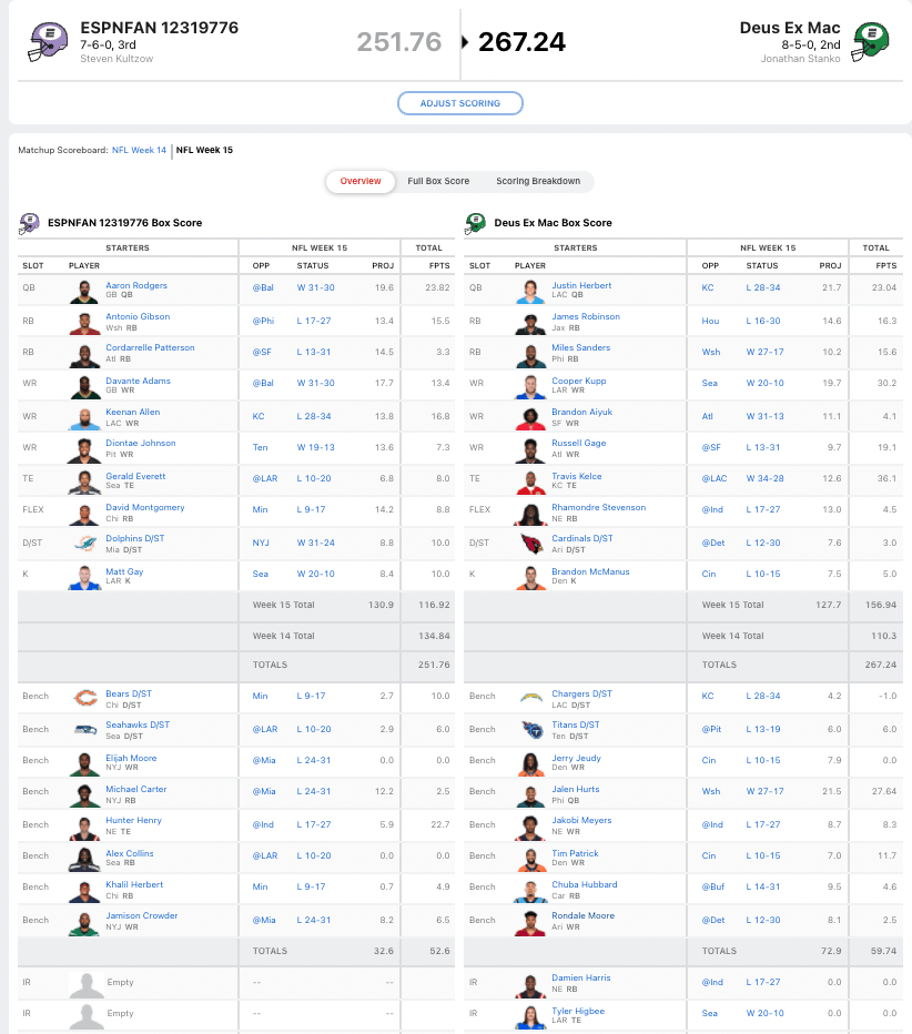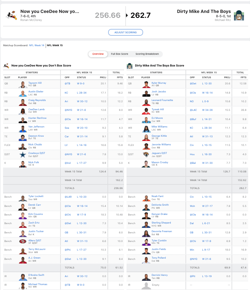 Taysom Hill scored 26.3 points for Ronan last week, but struggled in week 15 with just 9.46 points. Another huge loss for team Now You CeeDee Now You Don’t was Tyler Lockett who got stuck in COVID protocols. He had 24.7 points last week, and nobody picked up that slack in Ronan’s final week. Terry McLaurin had zero points in week 14 so Ronan sat him in week 15. The Football Team wide receiver had 6.1 points, which was would not have been enough to beat Ritz but would have been closer than Van Jefferson’s 4.3 points.