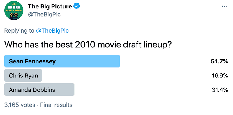 So today, in this first reflection of the drafts…Sean Fennessey wins the first one with 3-2-0 the final score. Amanda gets zero points. Sorry Amanda. I had to void one category…so hopefully that is not a trend going forward with these. So who did the audience choose?