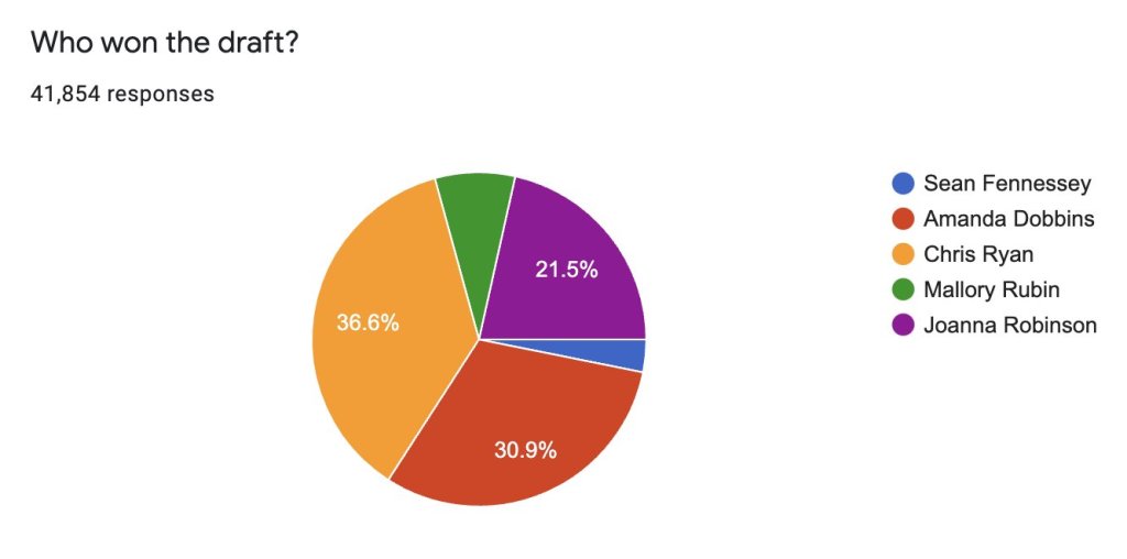 In the end…my final scorecard. Joanna Robinson wins with three…then Fennessey with one, Ryan with one and Mallory Rubin with one.