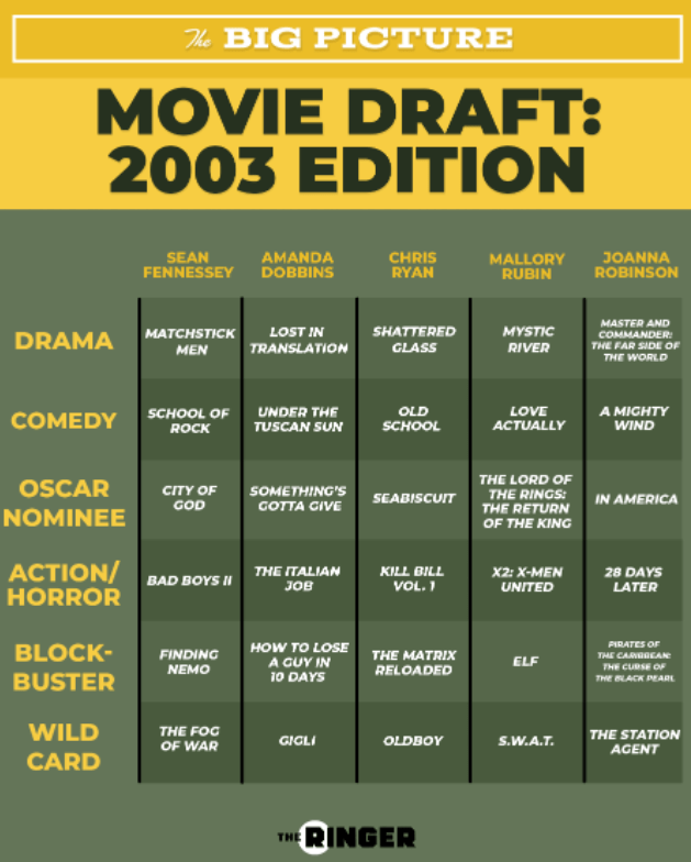 Now in my out of order rehashing, I have Sean Fennessey up two draft wins to one over Joanna Robinson. Other draft staples Amanda and Chris don’t have a win from me yet.