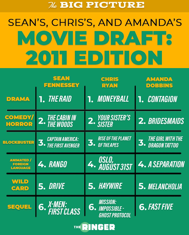 Here we revisit the 2011 movie draft, the second draft that Sean Fennessey, Amanda Dobbins and Chris Ryan did on The Big Picture. With this being the second go around, they improved the run of the draft a bit. Most notably, now you can draft for any category at any pick. More strategy now, which means more chaos.