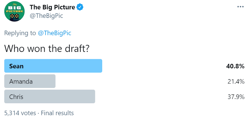 Sean Fennessey gets his first point. He won’t win, but he is on the board. Amanda and Chris are tied at 2-2, with Sean having one.