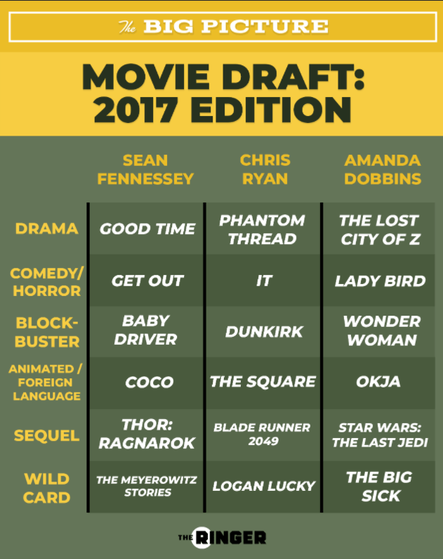 Heading into this draft, Chris Ryan has won two straight…at least in my book. Can he keep the hot streak going? Will Amanda Dobbins get his first win in my books? Or will Sean Fennessey expand on his lead and get his fourth victory? Time to start this reflection on their 2017 Movie Draft.