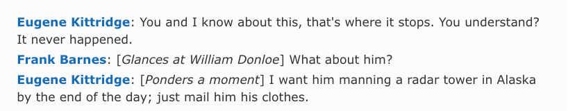 He is a cold son of a bitch. He wants to get his mission done. He is out to protect himself and ensure that his assets are intact. Also, Kittridge is fucking hilarious.