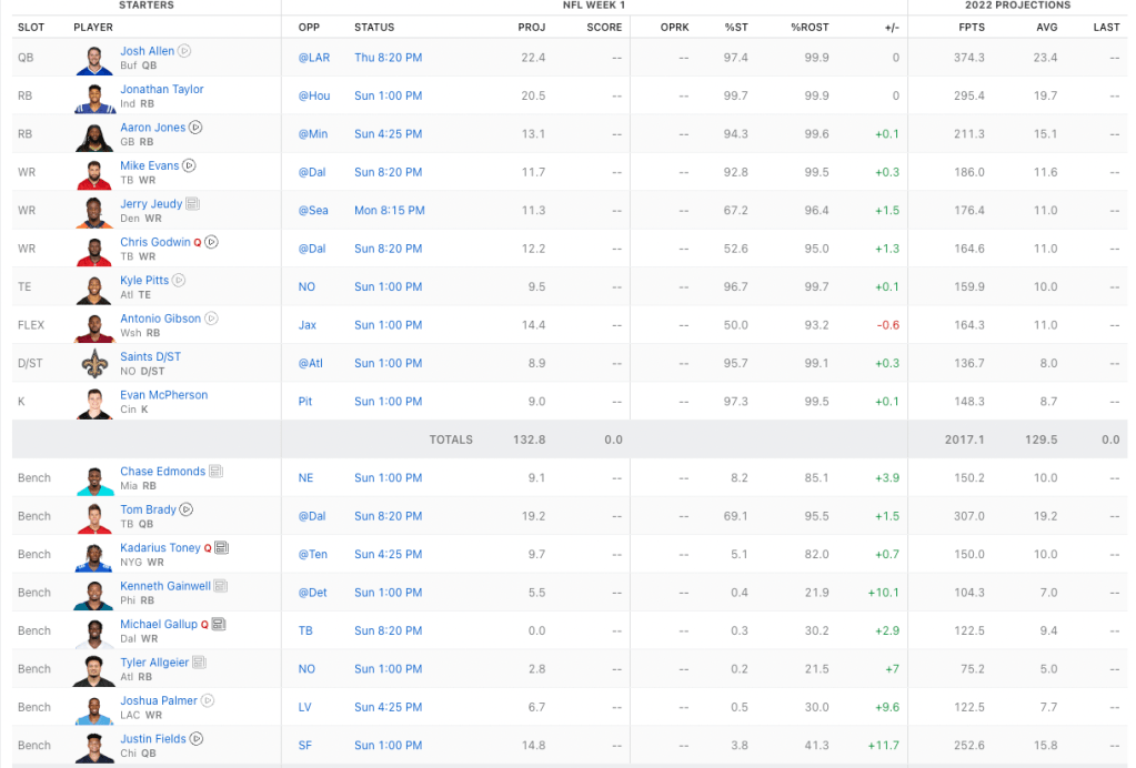 The best player on Buzzi’s bench is Kirk Cousins. Christian Kirk is a high ceiling guy if you are buying a Jaguars bounce back, but Russell Gage is a sneaky great option with Tom Brady as quarterback and Mike Evans and Chris Godwin being injury prone (or already injured).