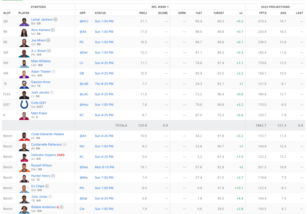 Lamar Jackson, Alvin Kamara, Joe Mixon, A.J. Brown and Mike Williams will all score points every week. However, Adam Thielen, Dawson Knox and Josh Jacobs are incredibly touchdown dependent. Thielen I like the most of the bunch. I am high on the Vikings this year.