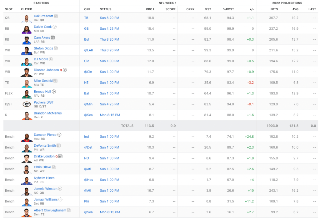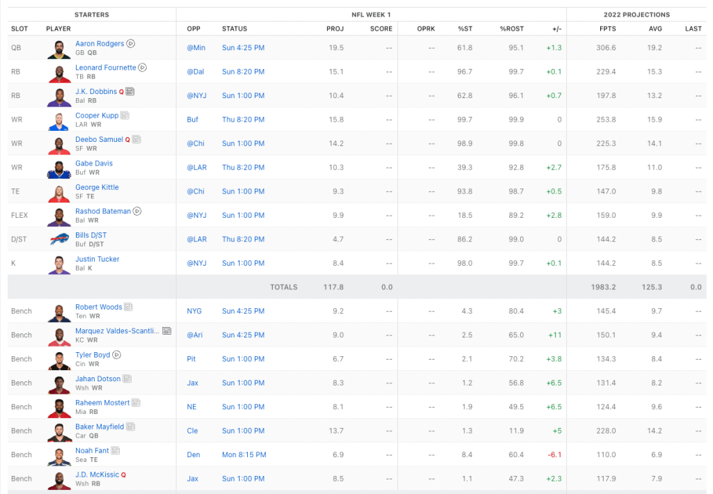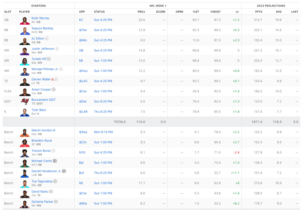 The remainder of his starting lineup is interesting because it is talented players on bad teams. David Montgomery and Darnell Mooney of the Chicago Bears, DK Metcalf, and Kareem Hunt of the Cleveland Browns. Buzzi is banking on workload with these players. They will be chasing points throughout the season (the first six games of Browns) so passing will be at a premium.