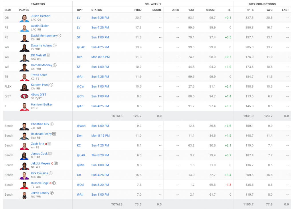 Justin Herbert and Austin Ekeler of the Los Angles Chargers. Davante Adams of the Las Vegas Raiders and Travis Kelce of the Kansas City Chiefs. Those are his top for projected scorers, and all of them play in the same conference. Probably a good strategy seeing how it is the best division in football.