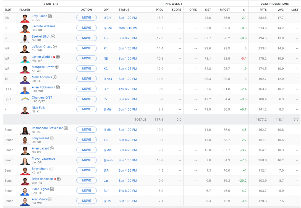 Not too pleased with how this turned out. My roster is a huge boom or bust potential. Trey Lance at quarterback is a bet on his rushing yards potential, and having Trevor Lawrence as backup is a bet on him actually having a coach who wants to coach.