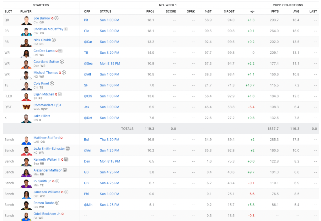 Tommy may be the team of shattered glass. Christian McCaffrey is the highest ceiling player if he can stay healthy. CeeDee Lamb is built of twigs, and Michael Thomas is still banged up as of writing and is coming off a season on injury., Elijah Mitchell is a rotation guy who needs to work on being strong as a bull. Matthew Stafford (his backup quarterback) has two Elbow issues. Odell Beckham Jr. is coming off major injury and who knows if he will play this year.