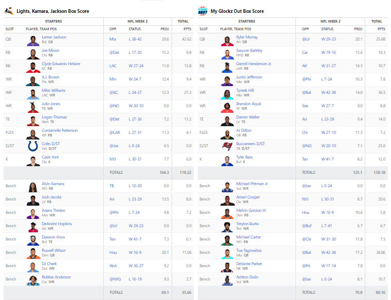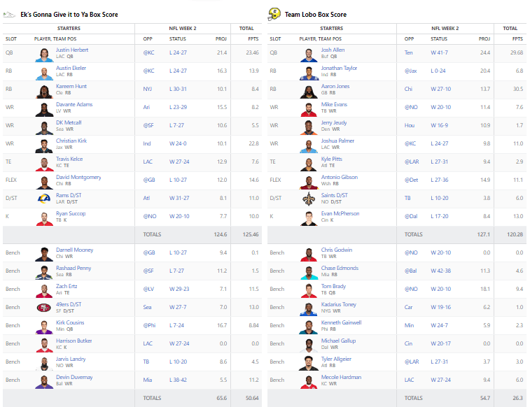 Buzzi may have to deal with a Justin Herbert injury, but that is a problem for week three and now a week two recap. You look at Kareem Hunt, Davante Adams and DK Metcalf all having single-digit points and you wonder how Buzzi pulled out this game. It all comes back to his third wide receiver spot, Christian Kirk of the Jacksonville Jaguars. The newly rich wide receiver scored 22.8 points when he was only projected for 10. He is getting a massive target share, and that is a positive thing for a team that will be involved in interesting game throughout the season. Is Kirk a slightly lesser version than Detroit’s Amon-Ra St. Brown.