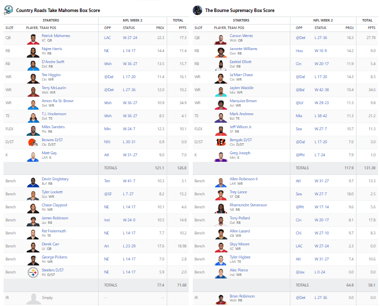 McGinnity sends RItz to 0-2 and improves to 1-1 himself behind the depth of his wide receivers. All of them scored double-digit points, and Rashod Bateman looks to be an emerging weapon for Lamar Jackson with a second straight game with a touchdown. McGinnity has depth at the wide receiver position with Jahan Dotson on his bench, and he has arguably looked like the best rookie wide receiver of the season thus far. Ritz may have the other with Drake London of Atlanta….he was also on RItz’s bench.