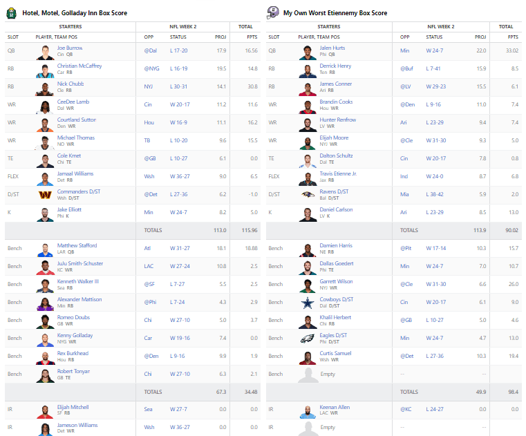 To Steve’s dismay, his bench of six players outscored his roster of 10 players. His beloved New York Get Garrett Wilson had 26 points on his bench, and New England Patriots running back Damien Harris found the end zone with 15.7 points as well. Steve has an empty bench if Keenan Allen doesn’t come off the IR this week.