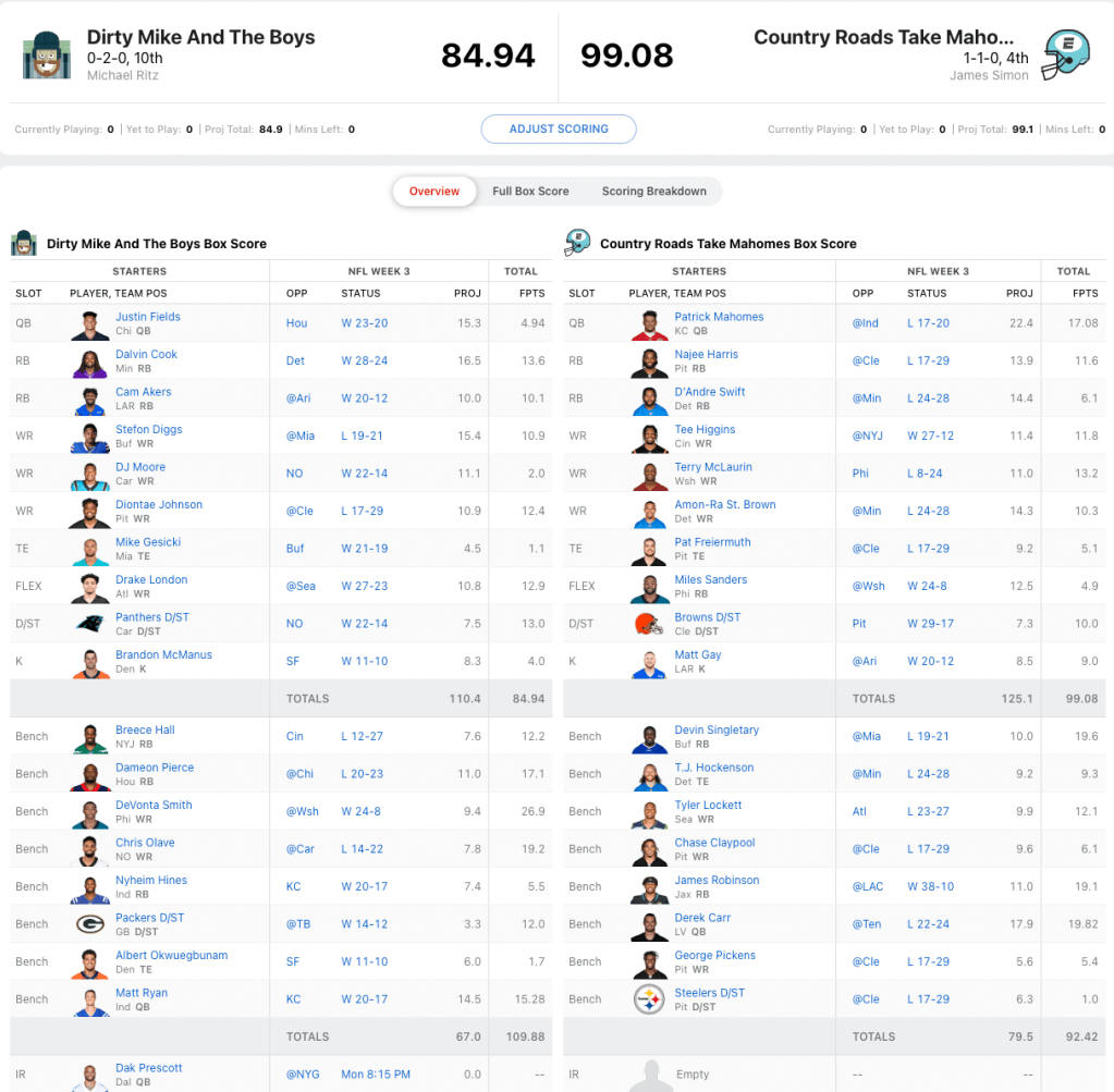 Patrick Mahomes vs. Justin Fields is an unfair matchup in real football, and it turns out the same in fantasy land too. Mahomes outscores Fields 17.08 to 4.94…but how about in the real world the Chicago Bears winning and the Kansas City Chiefs losing. How does that happen?