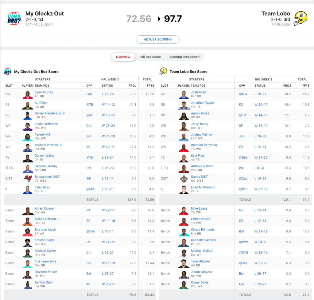 The MVP os this low-scoring matchup is Lobo’s bench deciding to all get hurt and make the decisions easy for him. Chris Godwin = out. Mike Evans = suspended. Michael Gallup = hurt. Jakobi Myers = hurt. There is was a lot of thinking for Lobo. He went with what he had. He was like the team playing with a backup quarterback who just runs the plays and it got him the win.