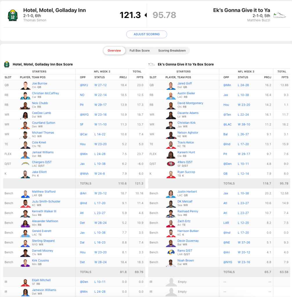 Standings Notable Week 3 Nuggets Points Scored Compared To Projected Through Week Three Week 3 Matchup Recap Lights, Kamara, Jackson (130.02) defeats Ooooo Jeudy James Jeudy (85.3) Rona gets off […]