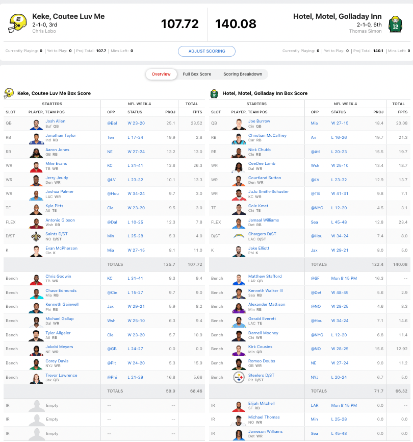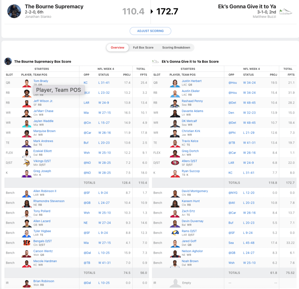 Buzzi was in absolute cruise control with this matchup. It was a big matchup seeing how we were both 2-1 entering the game, but the better team came out on top. Justin Herbert and Austin Ekeler combined for 53 points. That is pretty fucking good. And oh, Rashaad Penny put forward 28.2 points. Is he taking the crazy performance enhancing mojo that Geno Smith is? What is happening in the NFC West?? The points fiesta between Seattle and Detroit also benefited DK Metcalf who had 18.4 points, which is his best output of the season.