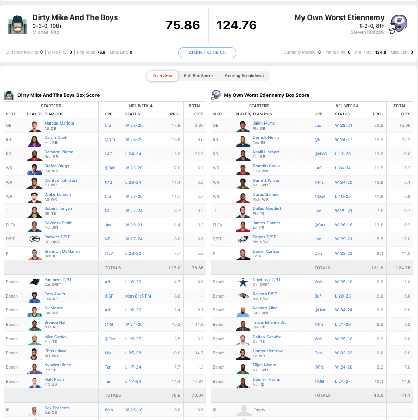 What is the key to Steve’s turnaround? Perhaps not playing his team’s namesake anymore? Travis Etienne Jr. has been put on the bench and his entire team has responded. Derrick Henry, after scoring a combined 16.7 points in the first two weeks, has reemerged with back-to-back 22+ point weeks. The Eagles defense has become a revelation, surely not something that Steve could have counted on. Philly’s defense and special teams outscored Jalen Hurts this week; another thing nobody saw coming.