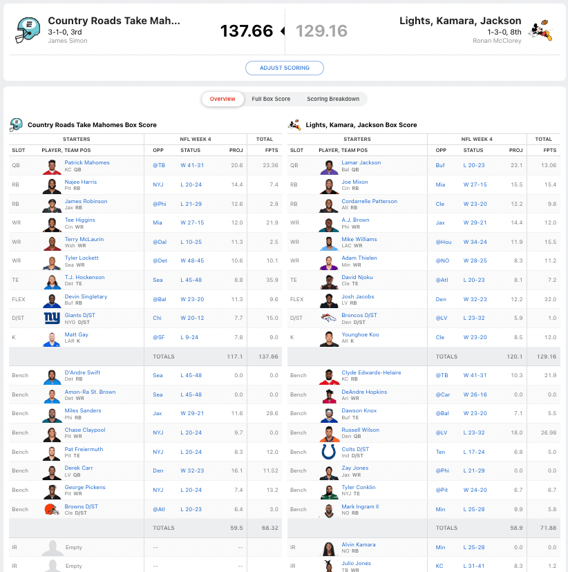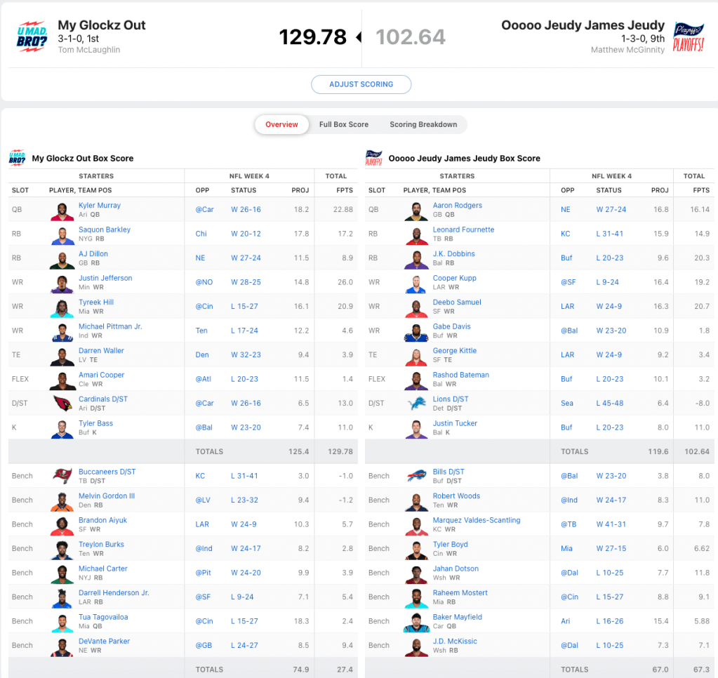 McLaughlin drafted two stud wide receivers, and that is exactly what he got. Justin Jefferson scored 26.0 points early on Sunday morning to get him off to a good start. Before that Tyreek Hill scored 20.9 points on Thursday to get him off to an ever better start.