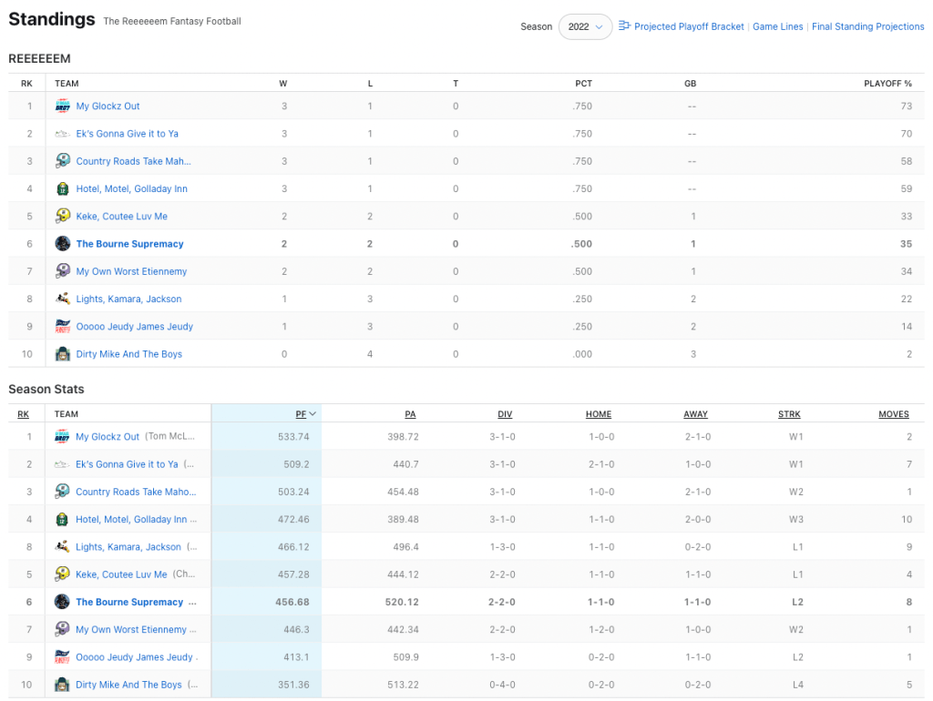 Standings Notable Week 5 Nuggets Points Scored Compared To Projected Through Week Three Week 5 Matchup Recap My Own Worst Etiennemy (124.76) defeats Dirty Mike And The boys (75.86) Steve’s […]