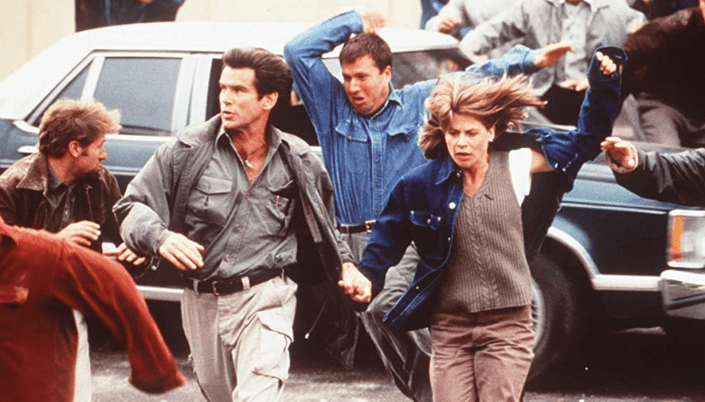 The most believable part of Brosnan’s performance is his smolder and chemistry with Linda Hamilton in their intimate one-on-one moments. Now I want to be clear, these romantic moments in Dante’s Peak are not good. The dialogue is very cringe, but Brosnan has whatever unique ability there is to embrace the awkwardness and make it work with a somehow magnetic smile. Brosnan as a romantic interest for any character always works. He is always able to pull something out of nothing.