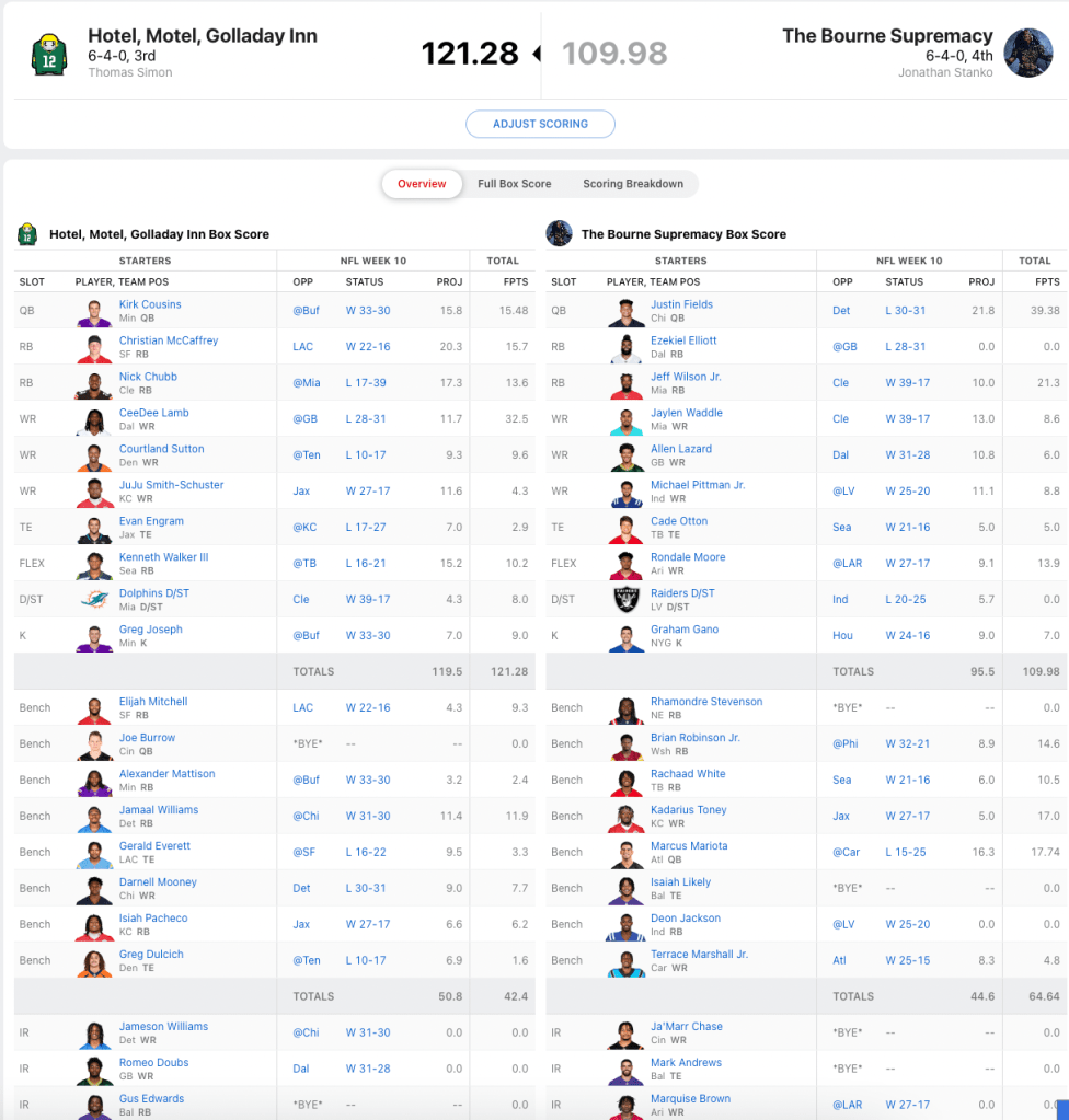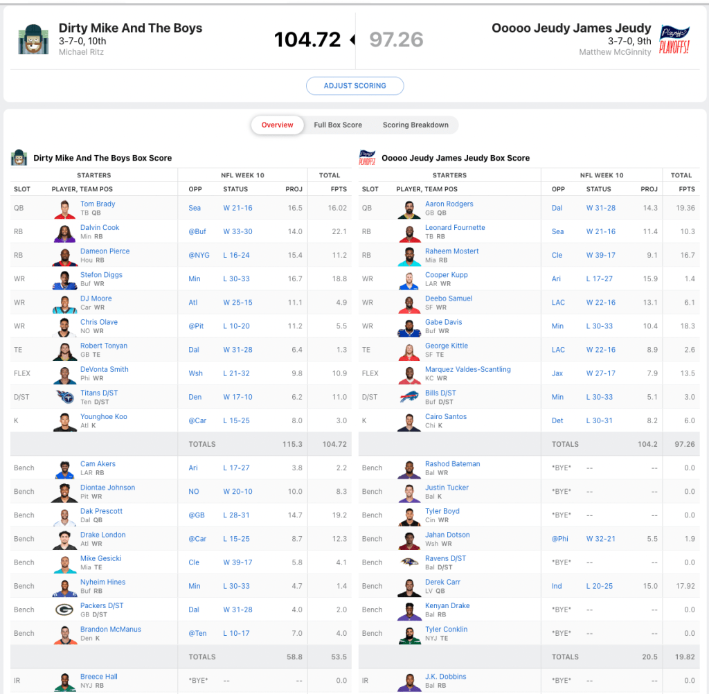 Ritz is the embodiment of Dan Campbell. He may not have the most talented roster, and it is often depleted on the offensive end…but when Ritz does have all (or most) his weapons, his team will fight for him and he will come away with a victory. Ritz may be a little lucky this week with a relatively low-scoring 104.72 winning score, but fuck it. You play who is in front of you.
