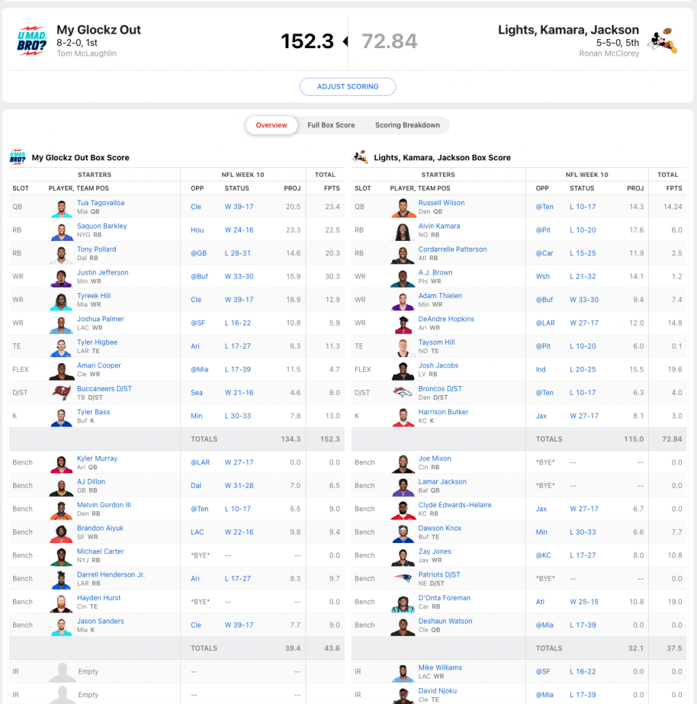 You look at Jimmy’s lineup, and the only players that “let him down” where Sanders and D’Andre Swift. They combined for 13.1 points, which was less than Gibson on the whole. Jimmy’s 118.74 points as a team marks the third time this season he has lost when scoring over 114+ team points. He has scored in triple figures the last three weeks after not scoring more than 90.72 between weeks Week 5 and Week 7.