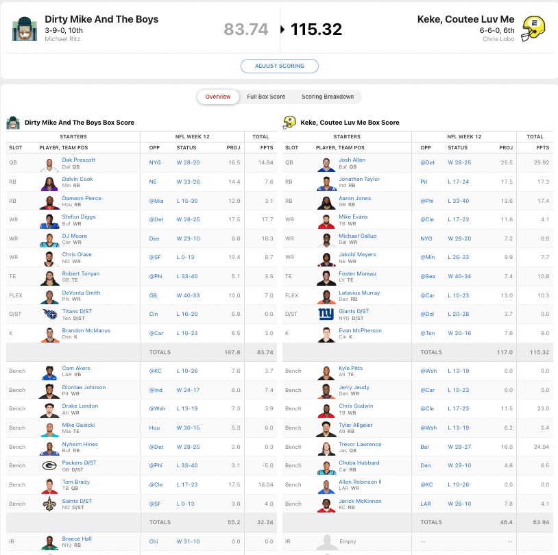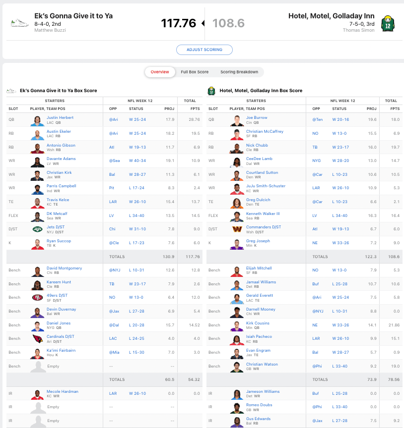 Besides that, these two teams matched up evenly. No crazy performances from Tommy’s squad; his highest scorer was Nick Chubb with 19.7 points. Tommy may write to Christian McCaffrey’s parents to ask how their son is doing health wise and give him a little pep talk to play better.