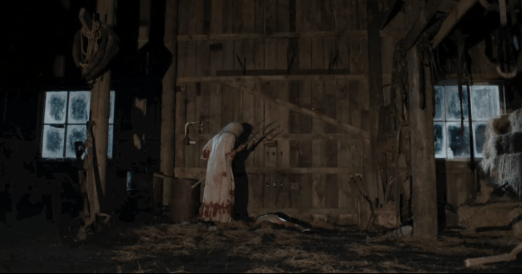 Then there is the death of Wayne. Haven’t seen this scene talked about much, but I loved the way it was put from paper to presentation. Wayne is looking for RJ and he steps into the barn. This is right when the killing takes off, so you know something is about to happen. You are on walking on your tip-toes hoping not to set anything off. Wayne is traversing around in his underwear and we see a shot of an exposed nail on the ground. Usually it cuts away, goes back to the nail, maybe cuts away gain, and the the director decides whether or not its false alarm terror or if you go Emily Blunt with it from A Quiet Place (2018). Ti West doesn’t shy away from it. You just see Wayne step on it. There was no brief reprise for the audience. Nope, he hurt himself, and he is going to get hurt more.