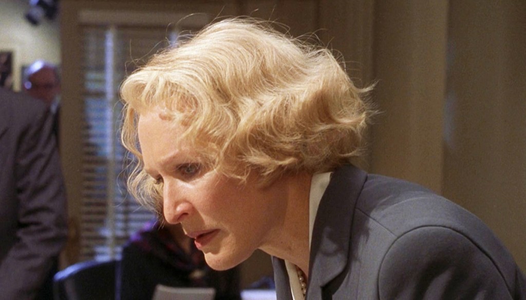 Glen Close is in her political mindset working it as Vice President Kathryn Bennet after being the First Lady Marsha Dale in Mars Attacks! (1996). The part of the VP is a little thankless because she is in one room and it is somewhat one dimensional, but damn if Close doesn’t make the most of her time on the screen. She has the scrunched down speaking into the pose down to a science, and her “fuck off” faces to her combative Cabinet members are wonderful. You are rooting for her when it comes down to the end, and when she shreds that paper, you want to cheer your heart out.