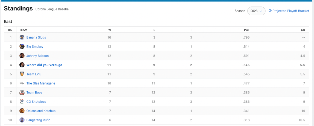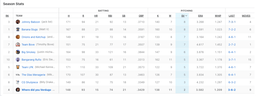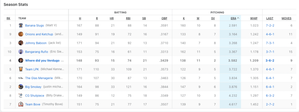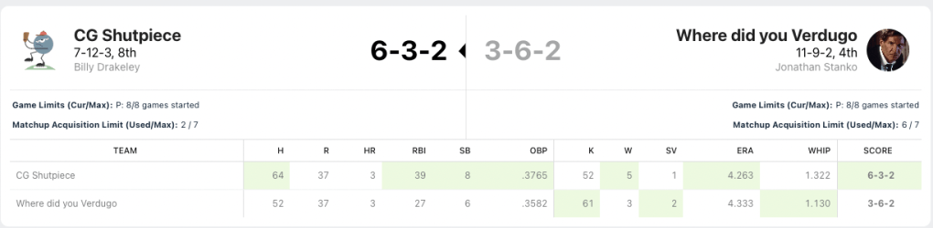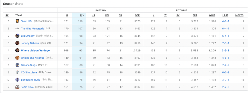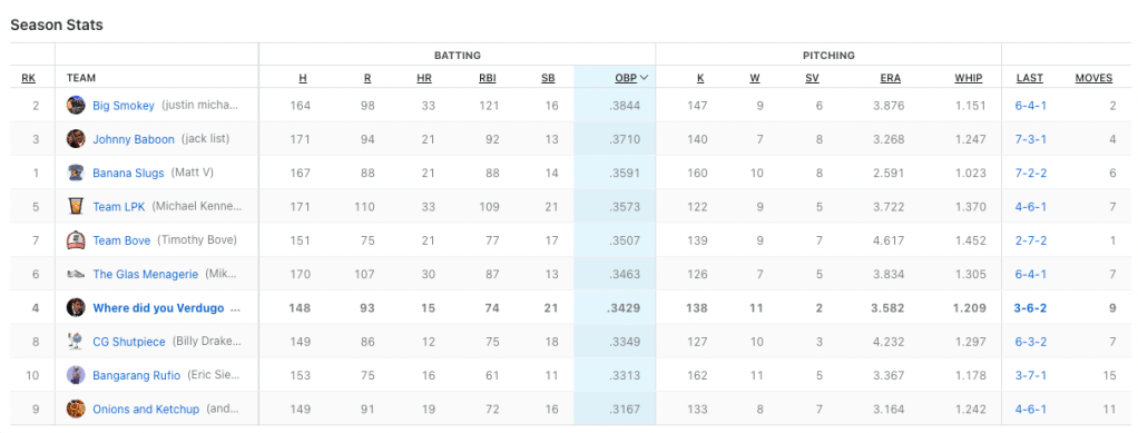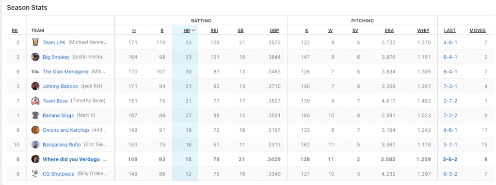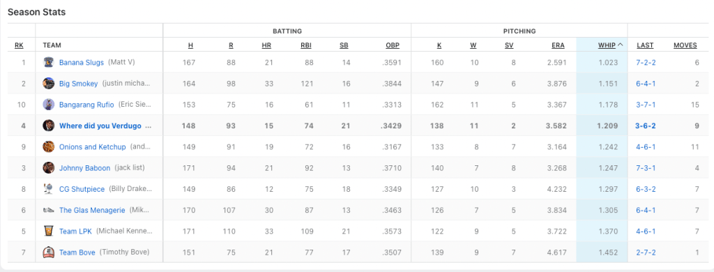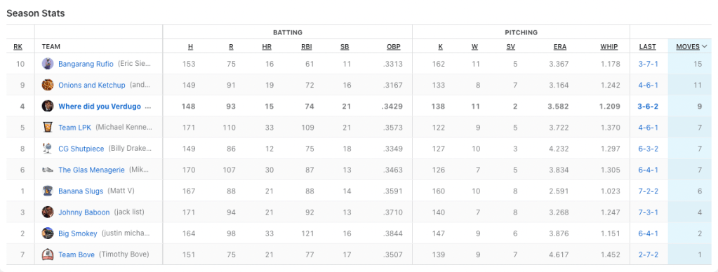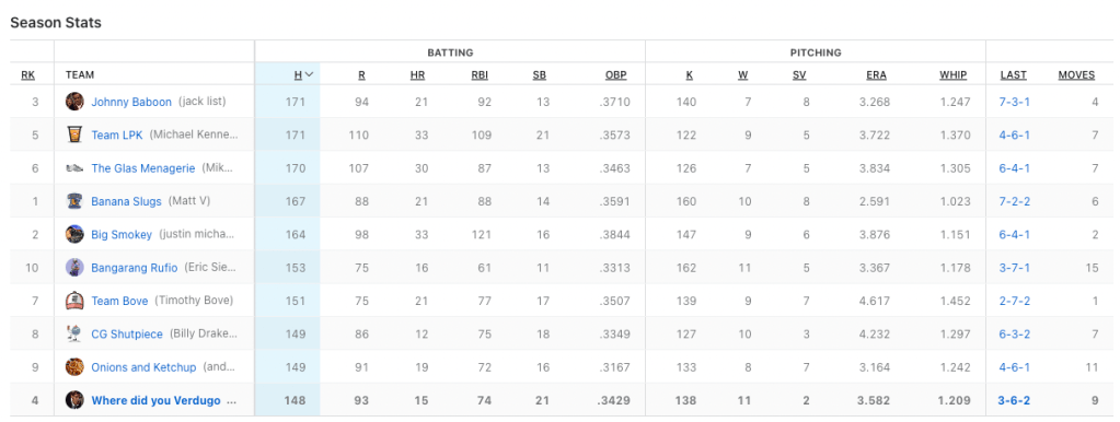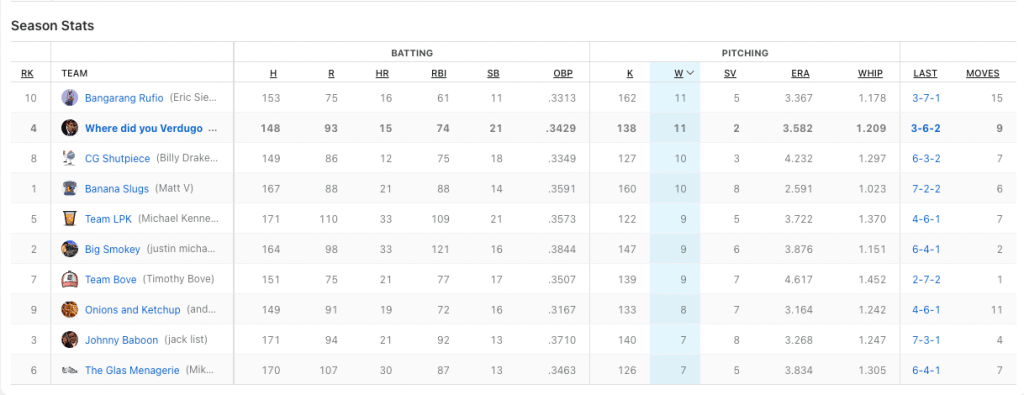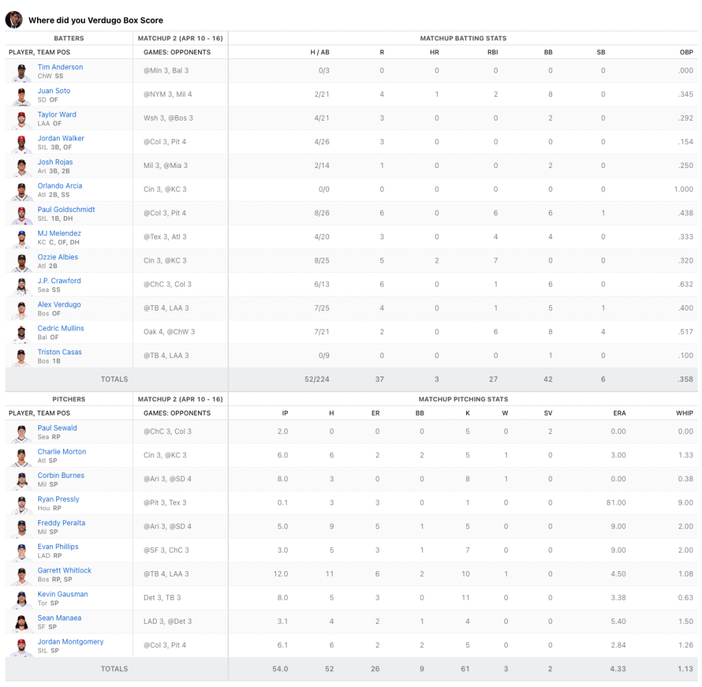 We need to hit the cages on team Where Did You Verdugo. Nobody to got for me this week. Based off my rough calculations, I only had two batters hit at over .333 for the week when i had them playing. Cedric Mullins continues to do beautiful work for me with seven hits in 21 plate appearances, and Midweek pickup J.P Crawford had six hits in 13 at-bats. My top hit-getter was Ozzie Albies with eight hits. He also had two home runs. He was not the problem. Billy had two players with double-digit hits; Bobby Witt Jr. (who I really wanted in the draft) had 12 hits, and Alec Bohm cracked 11 base knocks. Those two picked up for the slumping Julio Rodriguez who only had four hits in 25 at-bats. Can I petition for walks to be a category? I had 42 fucking walks.