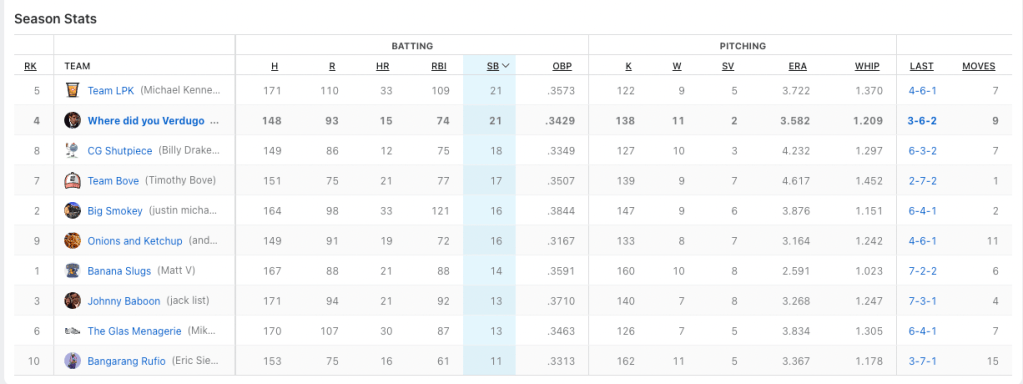 Soto not getting on base, also side Cruz and Anderson getting hurt, did not do do me any favors in the stolen base category. They had nine stolen bases for me last week. This week I had six total stolen bases. Billy took home the dub and took care of business with eight stolen bases. Have of those came from Bobby Witt Jr.