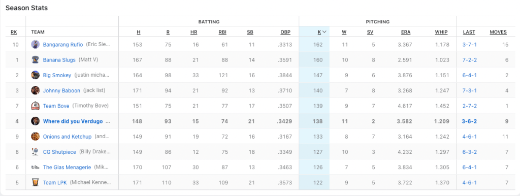 How is it that I lose the Wins category and but win the WHIP category. I do not totally understand how this is possible. Billy was really let down by Alek Manoah and Scott Barlow who both had over a 2.00 WHIP. Yikes. The only player I had that had over a 2.00 WHIP was Pressley who pitched only one third of an inning. With that being said, it was only a 0.008 difference. I got lucky in some respect. I an acknowledge that.