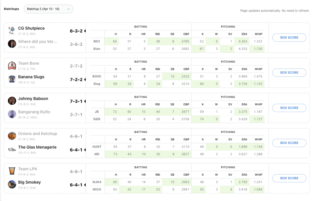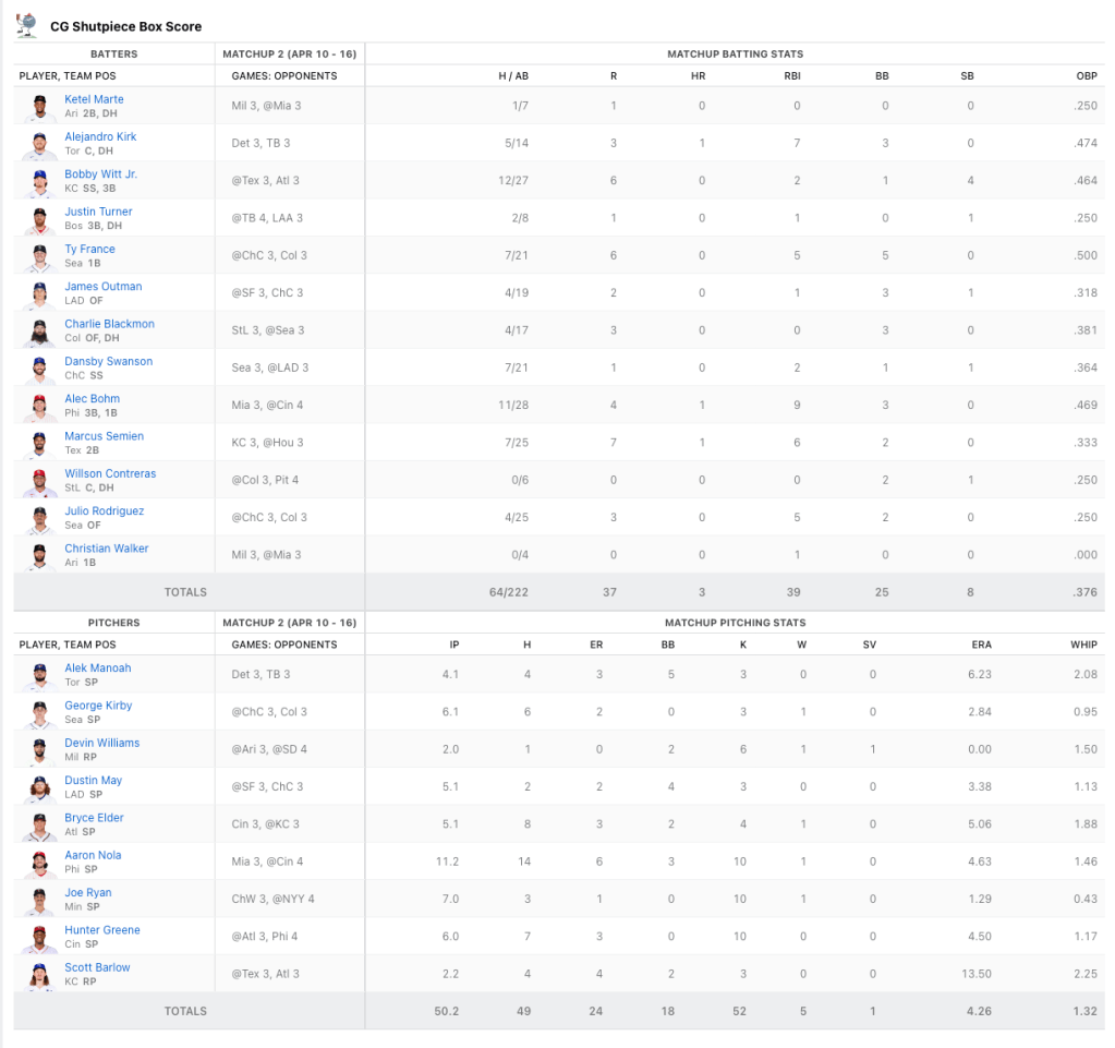 In the runs category, Billy and I tied. 37 runs apiece. Marcus Semien had a matchup high seven runs while Witt Jr., and Ty France each had six. Who is Ty France? I will admit I have never heard of this person before. I had a bit more of the balanced approach with the runs scored, having Paul Goldschmidt and Crawford each cross the play six times. In terms of runs left on the table with bench players, Billy may be kicking himself because he had two up on me, both of which came on Sunday with Wilson Contreras and Christian Walker. To madd a bit more salt into the wound, Billy played Ketal Marte in his utility spot, and he was not in the lineup on Sunday for Arizona.