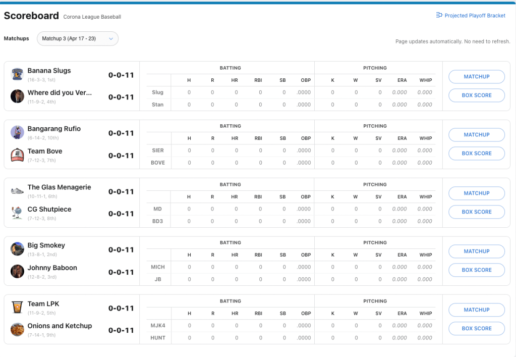 Home runs. Frankly, both Billy and I deserved to lose. Three blasts apiece. Kinda disgraceful. A pathetic performance. Billy’s blasts came from Bohm, Semien and Alejandro Kirk. My round-trippers came from Juan Soto (WHO WENT 2-FOR-21 THIS WEEK. ARE YOU KIDDING ME!?) and Ozzie Albies (he had a pair of them).