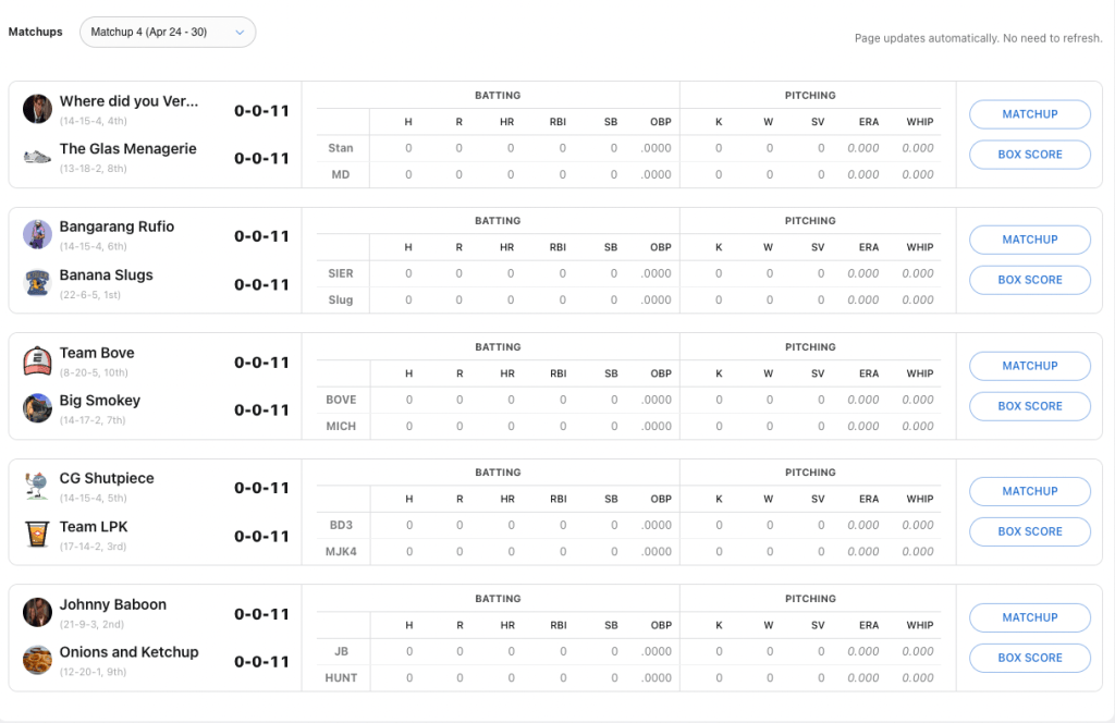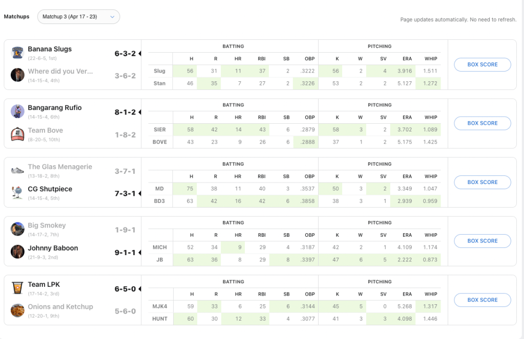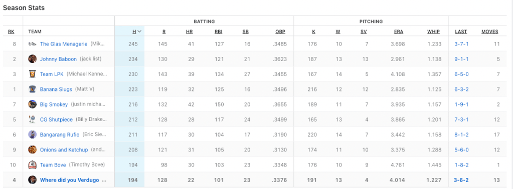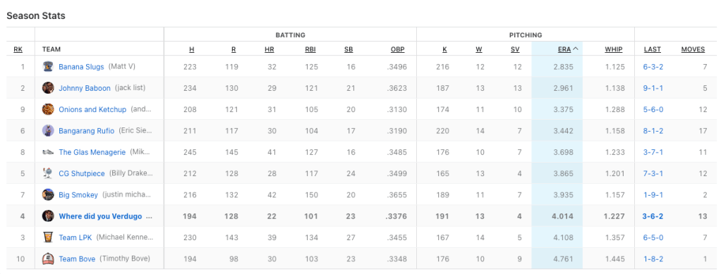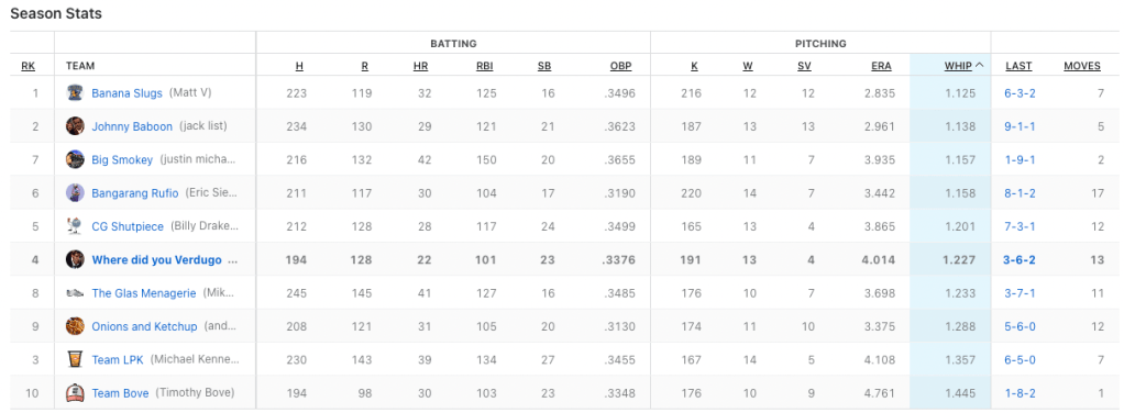 There were three elite ERAs this week by competitors, and I was not one of them. Neither was Vaghi, but he wasn’t getting dizzy with all the runners crossing home. I had an ERA of 5.127, which is good enough to get you sent down to AA. Vaghi had 3.916 so nothing to write home about, but he managed damage control well. Taj Bradley had a great short outing going 5.1 innings allowing zero runs. Grayson Rodriguez did the same going an even five innings. Yu Darvish basically did the same over 5.2 innings, allowing one earned run. I had two players with double-digit ERAs, so not great. Thanks Garrett Whitlock and Jordan Montgomery.