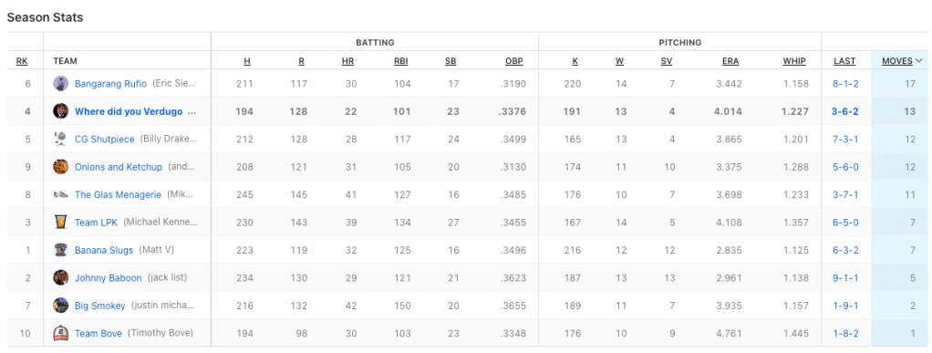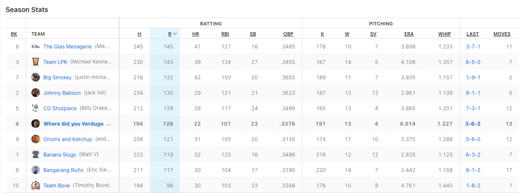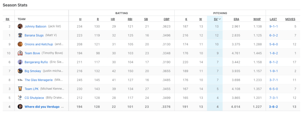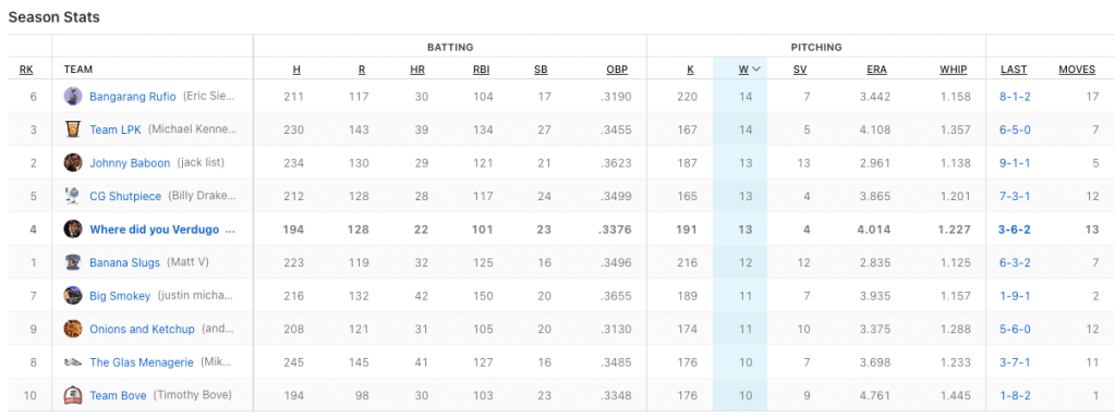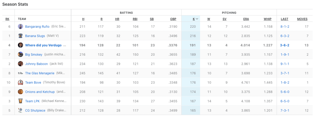 Came down to the last day. Chris Sale started me off great with 11 Ks over six innings. He was a gamble pickup and it worked. Then Kevin Gausman made up for a terrible early week start and stifled the Yankees striking out 11 over seven innings. I knew I sat at 53 strikeouts by the late afternoon on Sunday, but I was waiting it against against three starters for Vaghi. Yu Darvish, Jesus Luzardo, Grayson Rodriguez, David Bednar combined for 19 strikeouts on the last day.