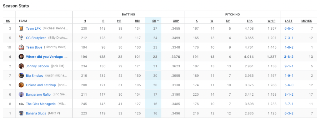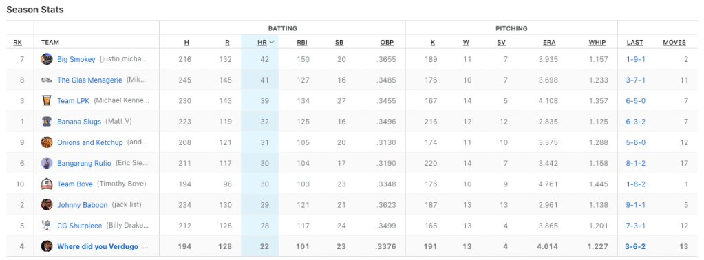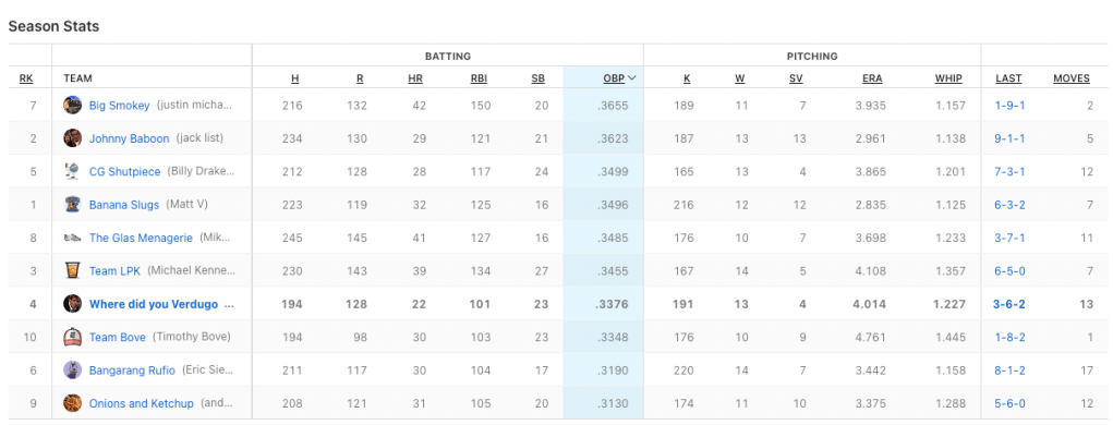 I touch on this a lot in the MVP/LVP discussion, as well as later down in this blog. Staying broad here…you really can not get much closer than this. One more person on base for Vaghi and he would have won the the category. The margin is crazy. It is a game of inches in fantasy baseball. Luis Robert Jr. was dismal for Vaghi, but this dude Mike Trout picked up the slack with a .455 OBP. I want to think Alex Verdugo, Triston Casas, Juan Soto and Jordan Walker for having a .400 OBP or higher when I was playing them.