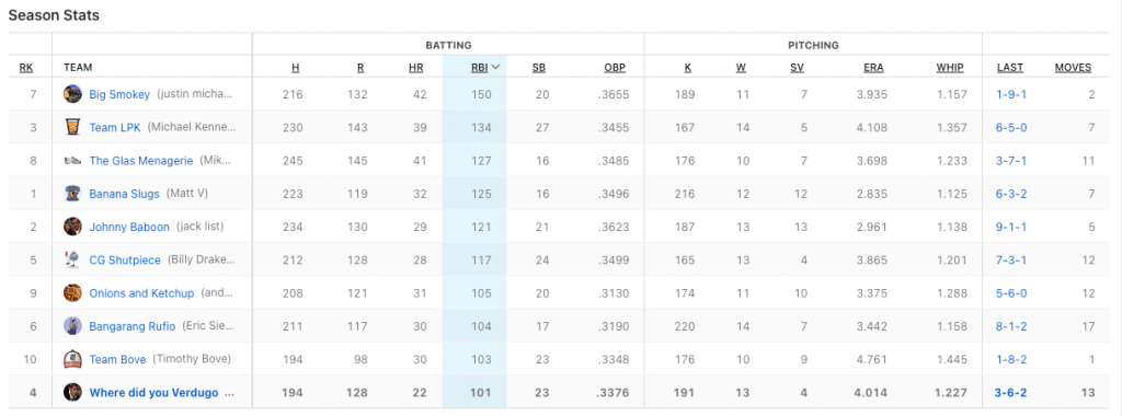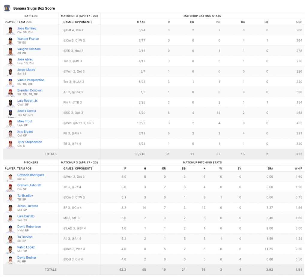 14 RBIs from one person has to be a record for this season thus far, right? That is too much research now, so I am going to run with it. Adolis Garcia hit three home runs in one game to help Vaghi dominate the category in this matchup with me. Jose Ramirez had seven RBI for the second best total. I had no player with more than seven RBI. Alex Verdugo had five and Josh Rojas served up four RBI. My leader was Ozzie Albies, and he did so with four hits in 21 plate appearances.