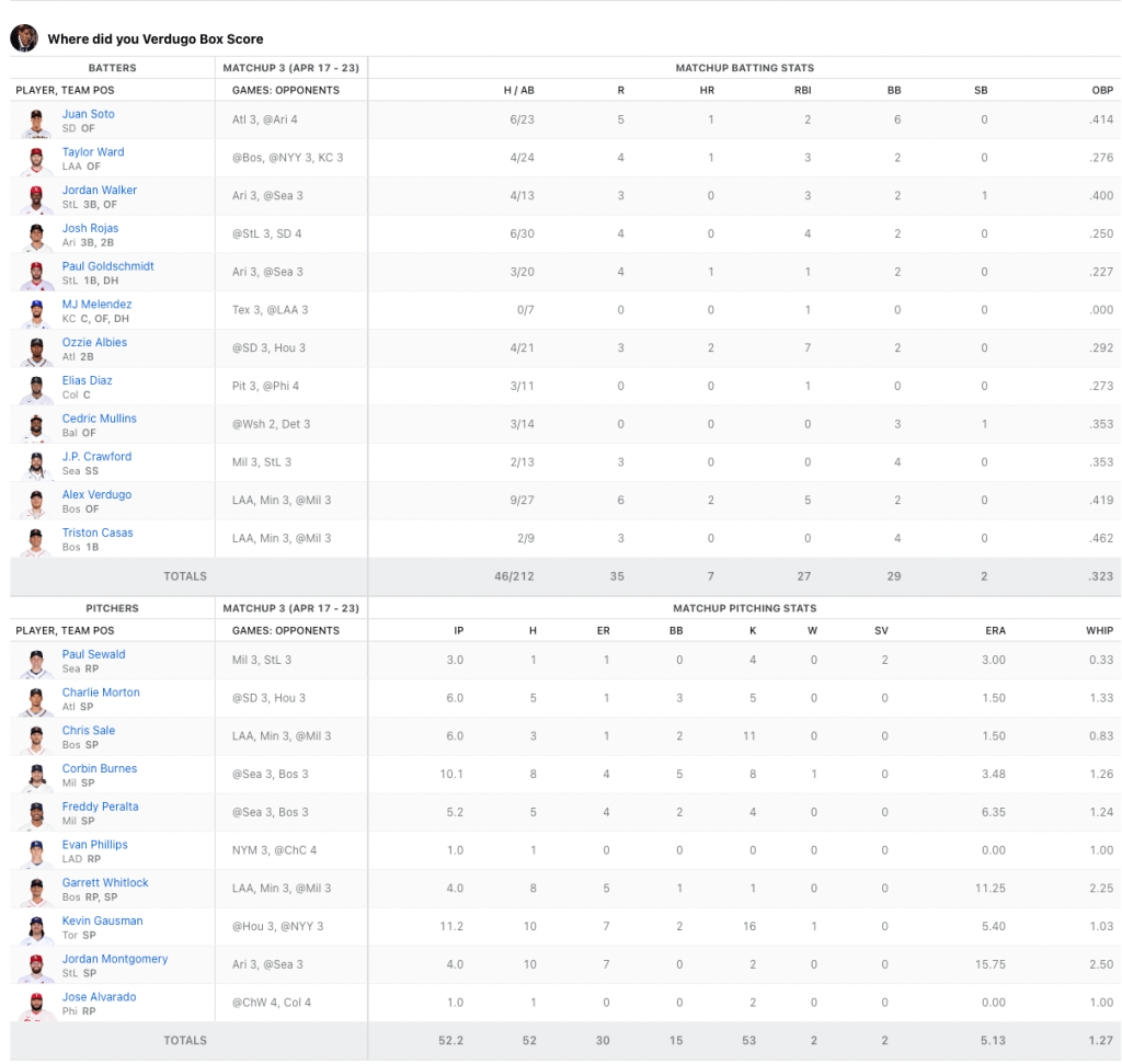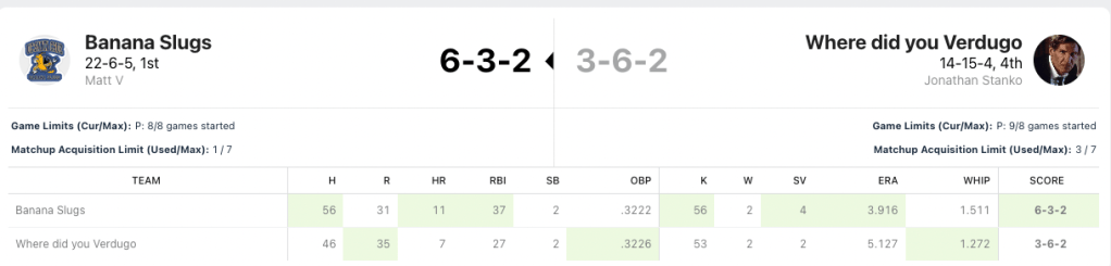 There was a moment in this matchup where I was winning on Sunday. I thought that I had a shot. But then Yu Darvish had to go and pitch well and destroy my only chances. Also David Bednar coming from out of nowhere to get two strikeouts as well. Very, very, frustrating.